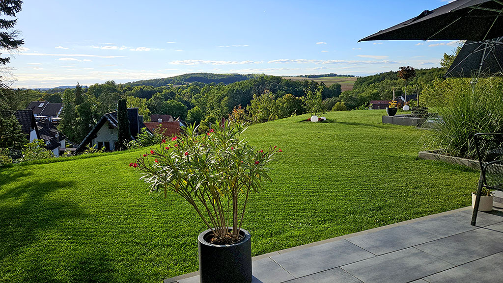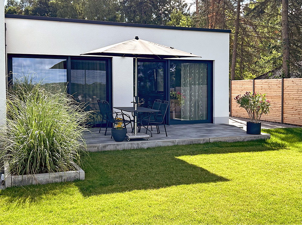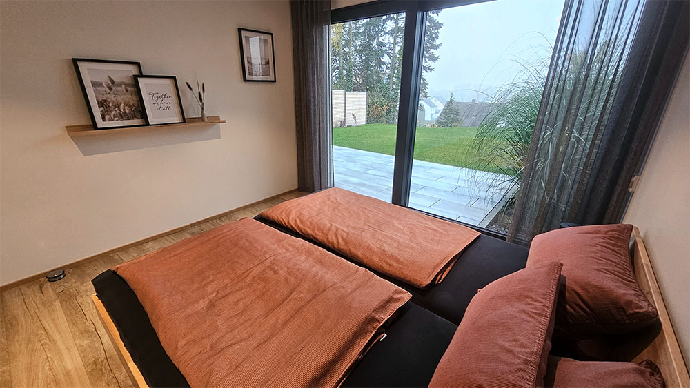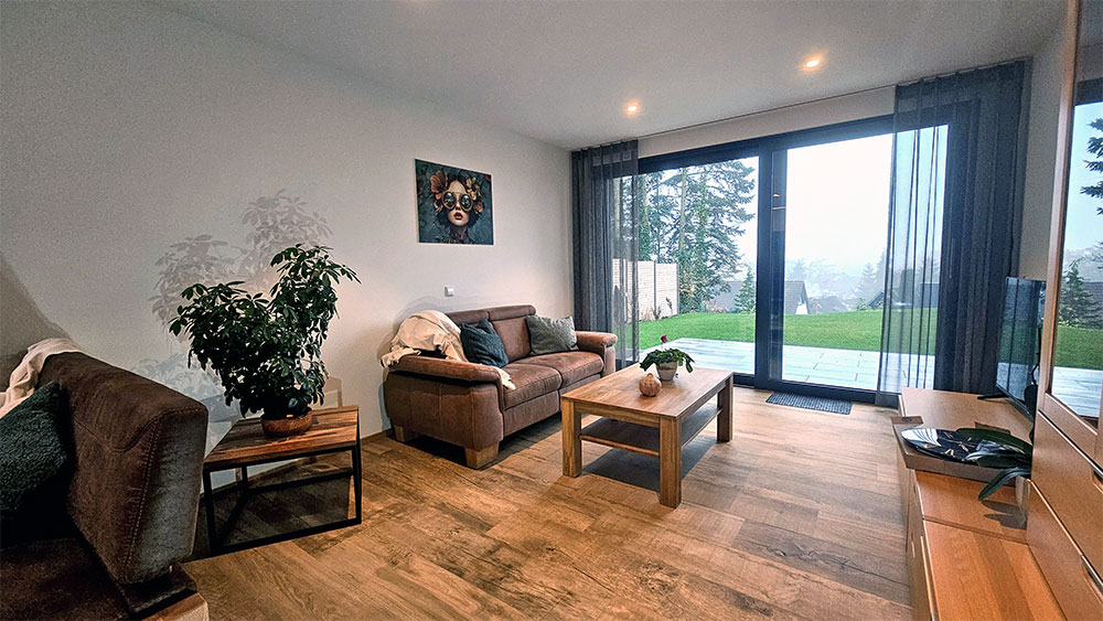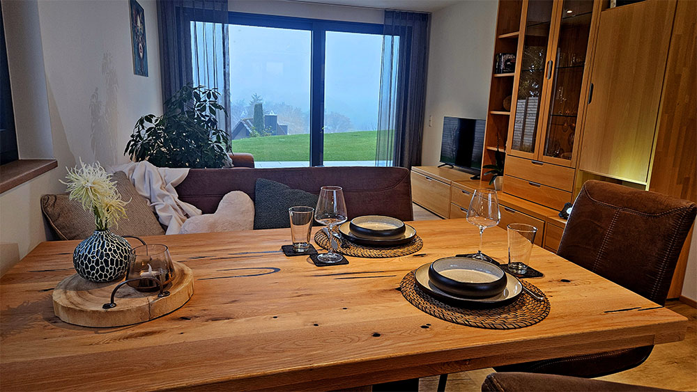Ein Blick durch die Fenster und auf die Terrasse zeigt Dir sofort, warum ich mich hier so wohlgefühlt habe: „Des is fei a traumhafter Ausblick!“ Die Wiesen, der Garten, die Natur – all das schenkt Ruhe und ein echtes Ankommen-Gefühl.